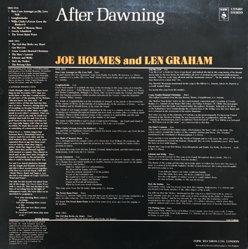 From the sleeve notes by Robin Morton: I little thought when I made these recordings in late December 1977 that two weeks later to the day I would receive the sad news of the passing of Joe Holmes. I did not know Joe very well – of course I knew of him and had met him once or twice. However, during that day of recording we became friends and I looked forward to other times we might spend in each other's company. That was not to be, and it can only be small consolation that both Joe and Len were in good form for the session and that Joe was especially happy with that we had recorded. We hope this record will serve as something of a memorial to the man.
